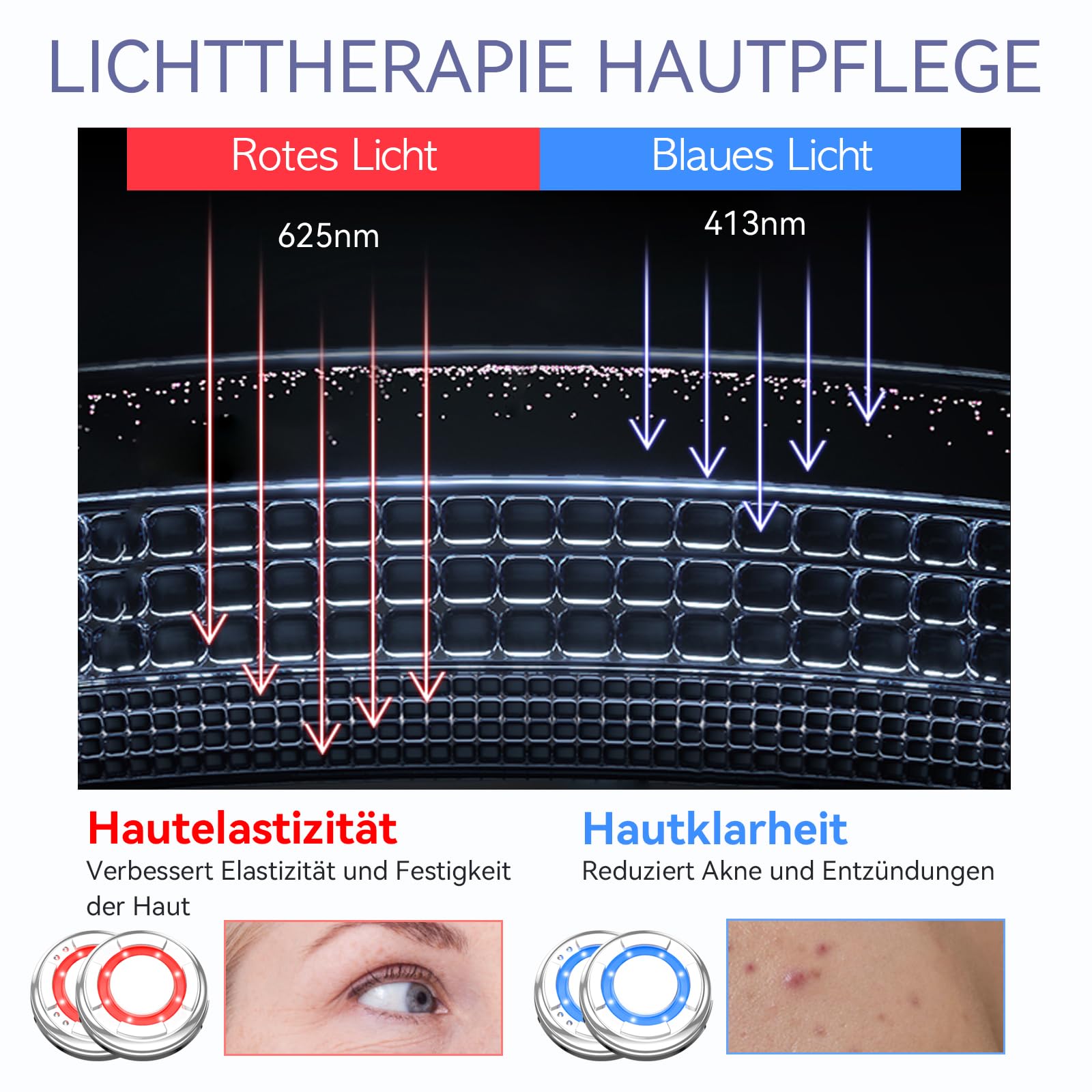 - 【Roja y azul】 La roja (longitud de onda 622 nm ± 10 nm) puede promover la producción de colágeno, mejorar las líneas finas de los ojos, reparar la piel dañada, restaurar la elasticidad y hacer que la piel sea suave y tersa. La azul (longitud de onda 470 nm ± 10 nm)tiene el efecto de inhibir rápidamente la inflamación, puede penetrar en la corteza por debajo de 0.25 mm, destruyendo el ambiente de vida de las bacterias, reduciendo la formación de acné.