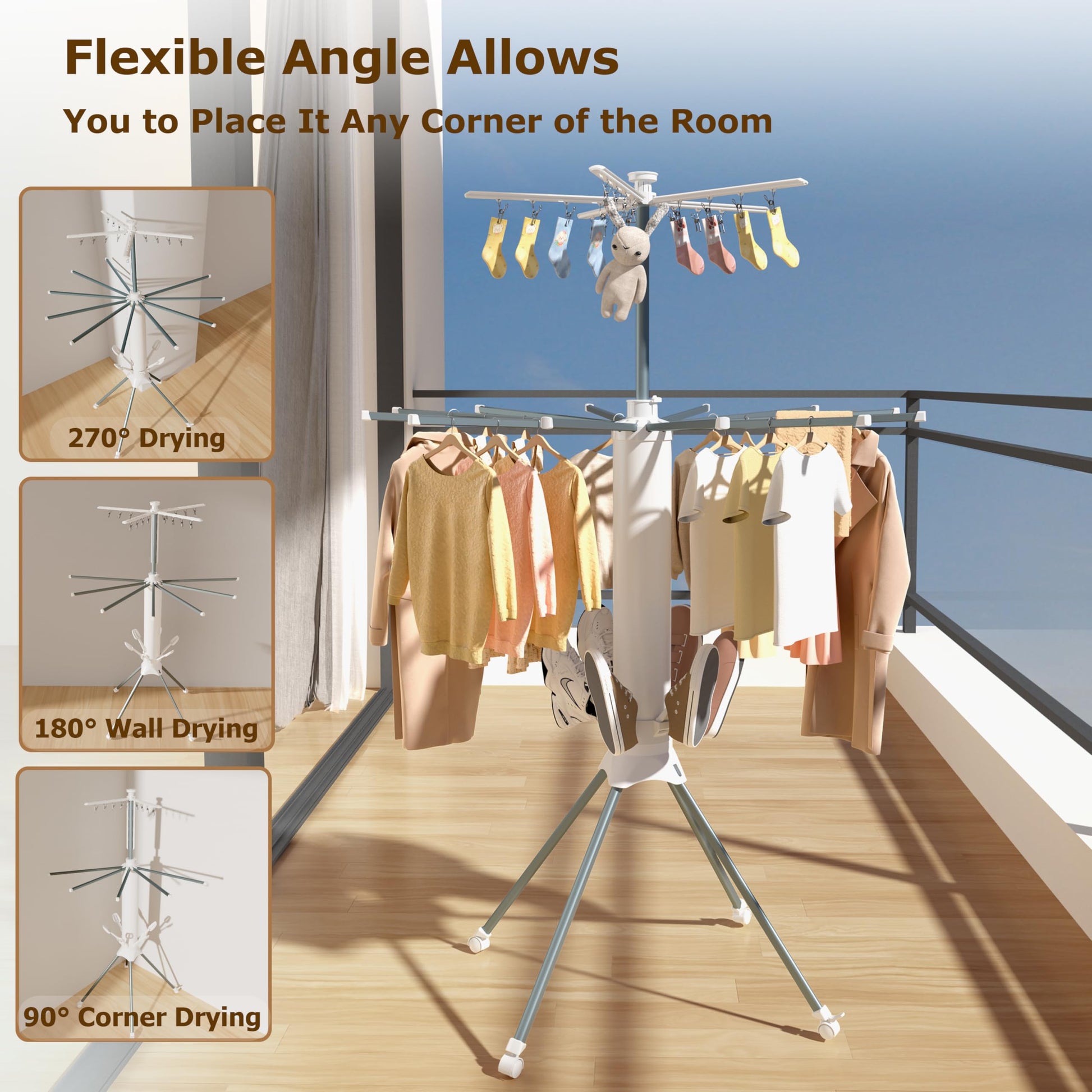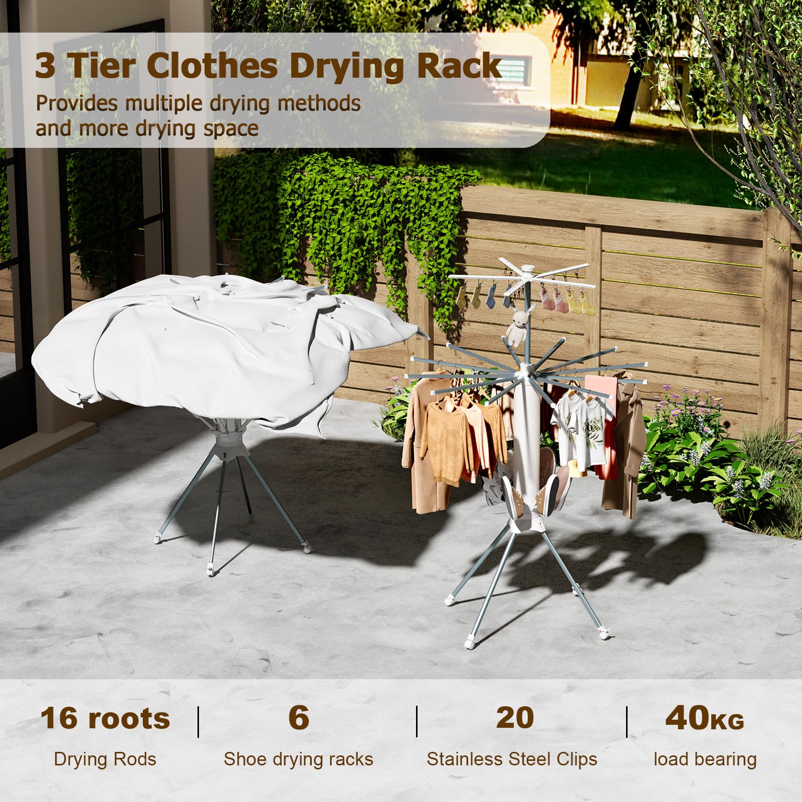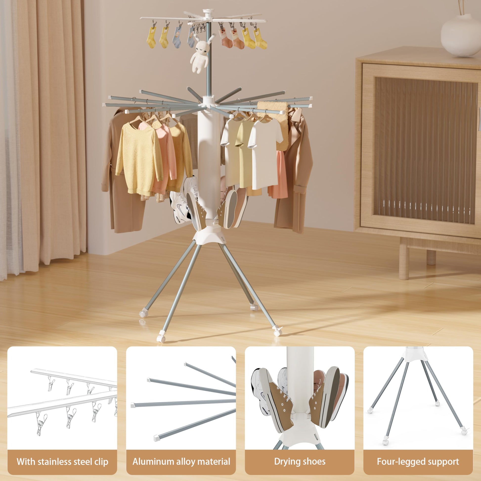 - 3 capas de espacio de secado: esta torre tendedero cuenta con 3 capas de espacio de secado. La primera capa está equipada con 6 estantes para secar zapatos que pueden secar 3 pares de zapatos al mismo tiempo. El segundo piso está equipado con 16 barras de secado de ropa, adecuadas para secar ropa, faldas, edredones, etc. En el tercer piso hay 5 barras de secado de ropa, cada una equipada con 4 clips, con un total de 20 pinzas para la ropa, adecuadas para secar calcetines, ropa interior y otros artículos pequeños y pueden satisfacer las necesidades diarias de secado de la familia.