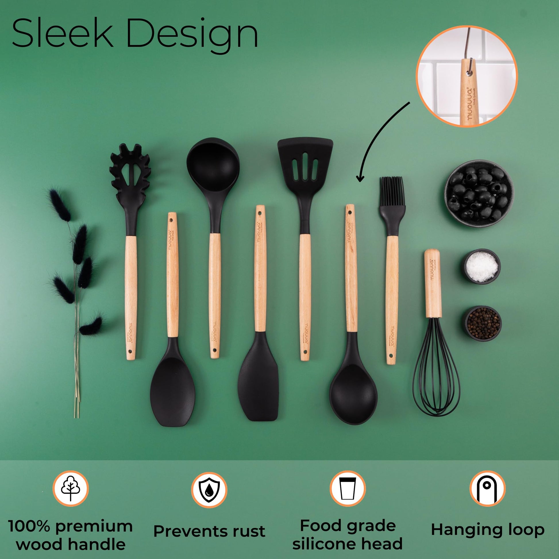 🪵 Materiales premium: Silicona resistente al calor y asas de madera duradera y ecológica para un agarre cómodo y un estilo elegante.