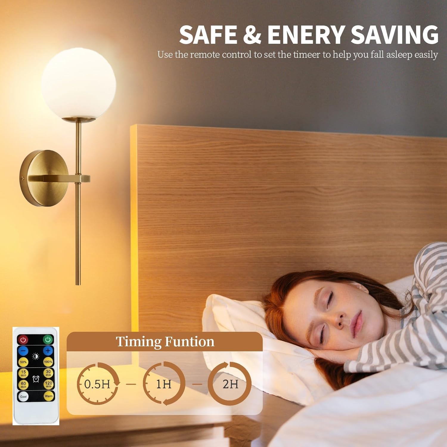 Lámpara de pared inalámbrica con cuerpo de latón y pantalla de globo de vidrio esmerilado lechoso que crea un ambiente cálido y suave, perfecto para cualquier espacio moderno o vintage.