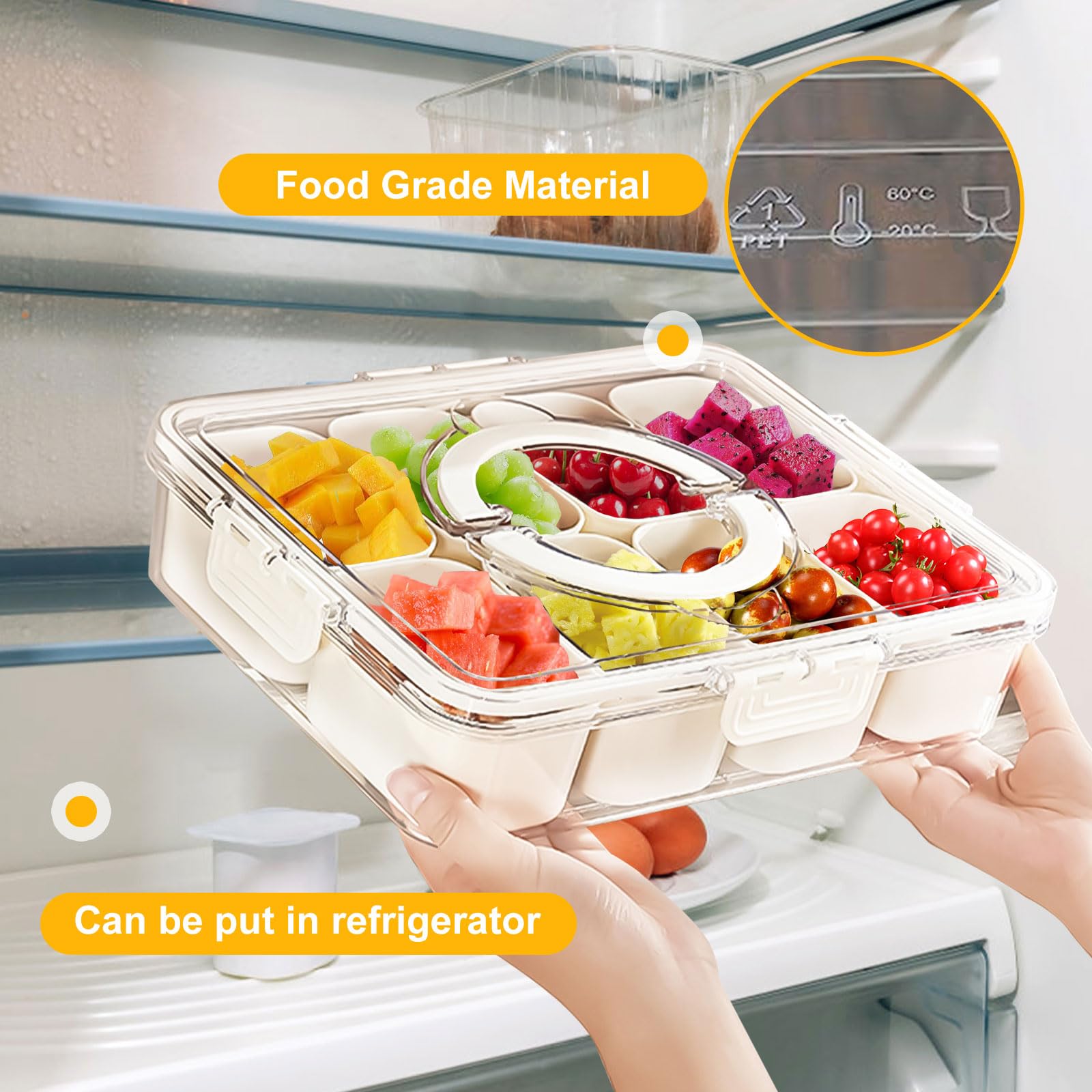- Diseño portátil: un asa está en la tapa, que es fácil de llevar, el diseño de hebilla a presión puede hacer que la tapa se conecte firmemente con el recipiente, por lo que puedes utilizar el mango con confianza para llevar la caja de aperitivos a cualquier lugar. Ya sea que estés organizando una reunión familiar, una noche de juegos o una celebración de vacaciones, el mango de nuestra bandeja de aperitivos permite servir sin esfuerzo.