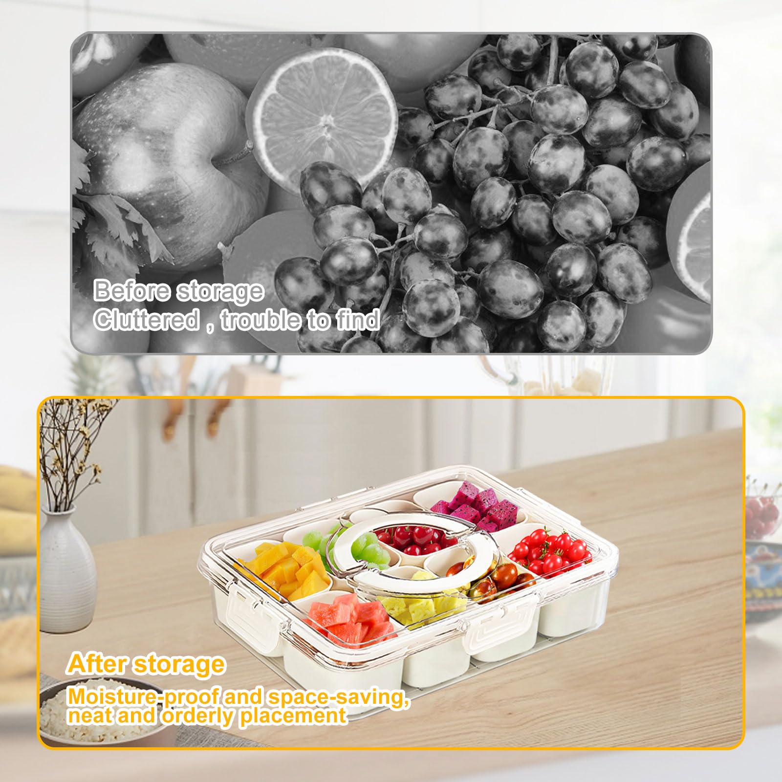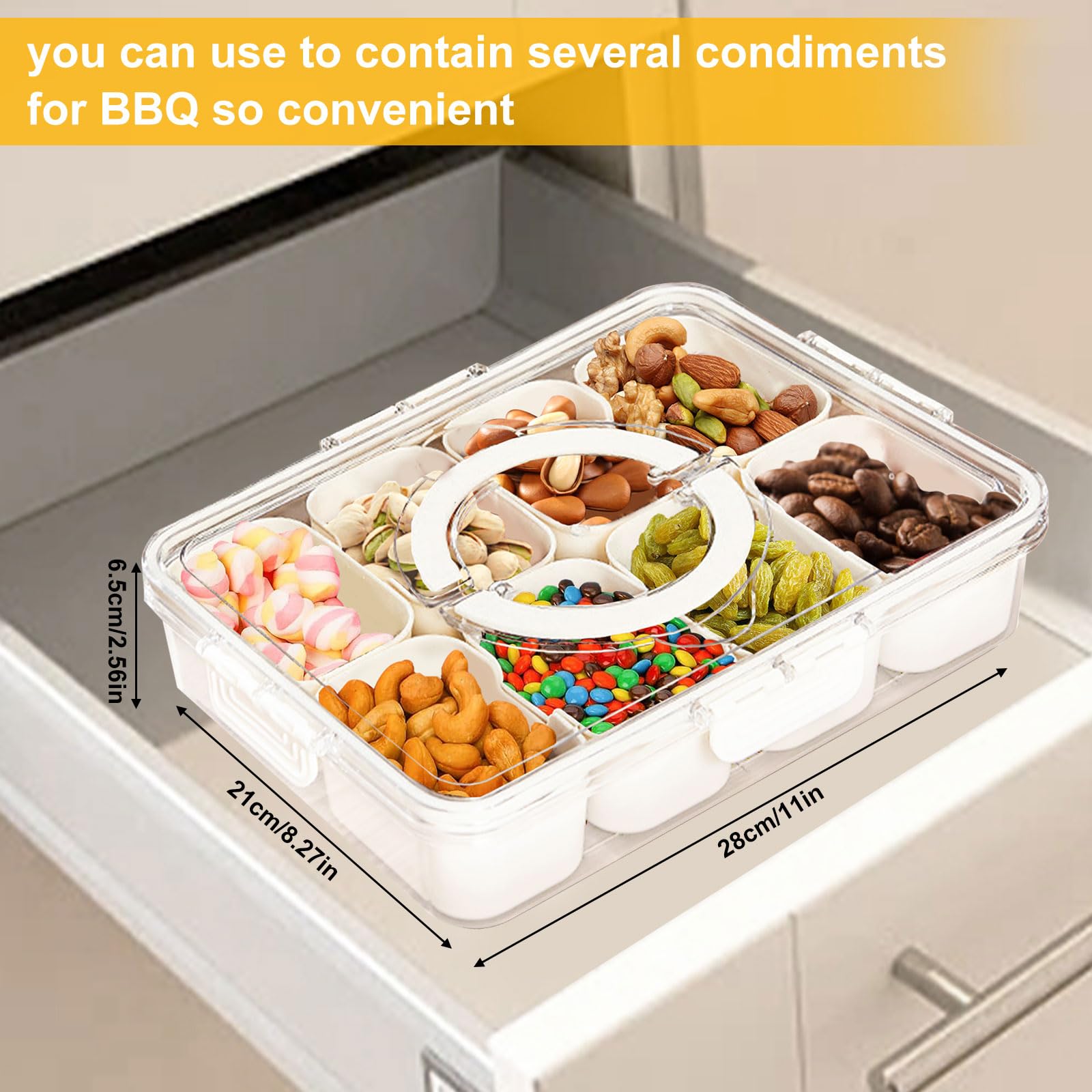- Versátil: la caja de aperitivos tiene 8 compartimentos extraíbles, cada caja de compartimentos blancos te permite organizar y mostrar una amplia gama de verduras, nueces, galletas y otros aperitivos. Puedes almacenar alimentos uno por uno para evitar la mezcla y puedes ayudarte a limpiar y ordenar la cocina o la cubierta. También puedes sacar estos pequeños compartimentos para contener artículos más grandes.
