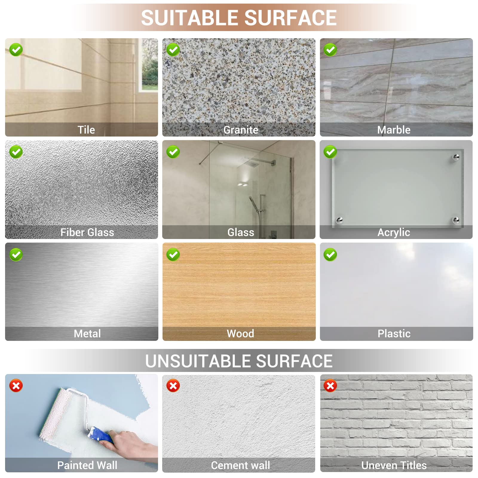 🛠️ Instalación fácil y sin daños: Sin herramientas, sin taladros, tornillos o agujeros. Se fija por succión en superficies lisas y planas como azulejos. Se puede quitar fácilmente sin dejar marcas y es reutilizable. (No apto para esquinas ni superficies irregulares).