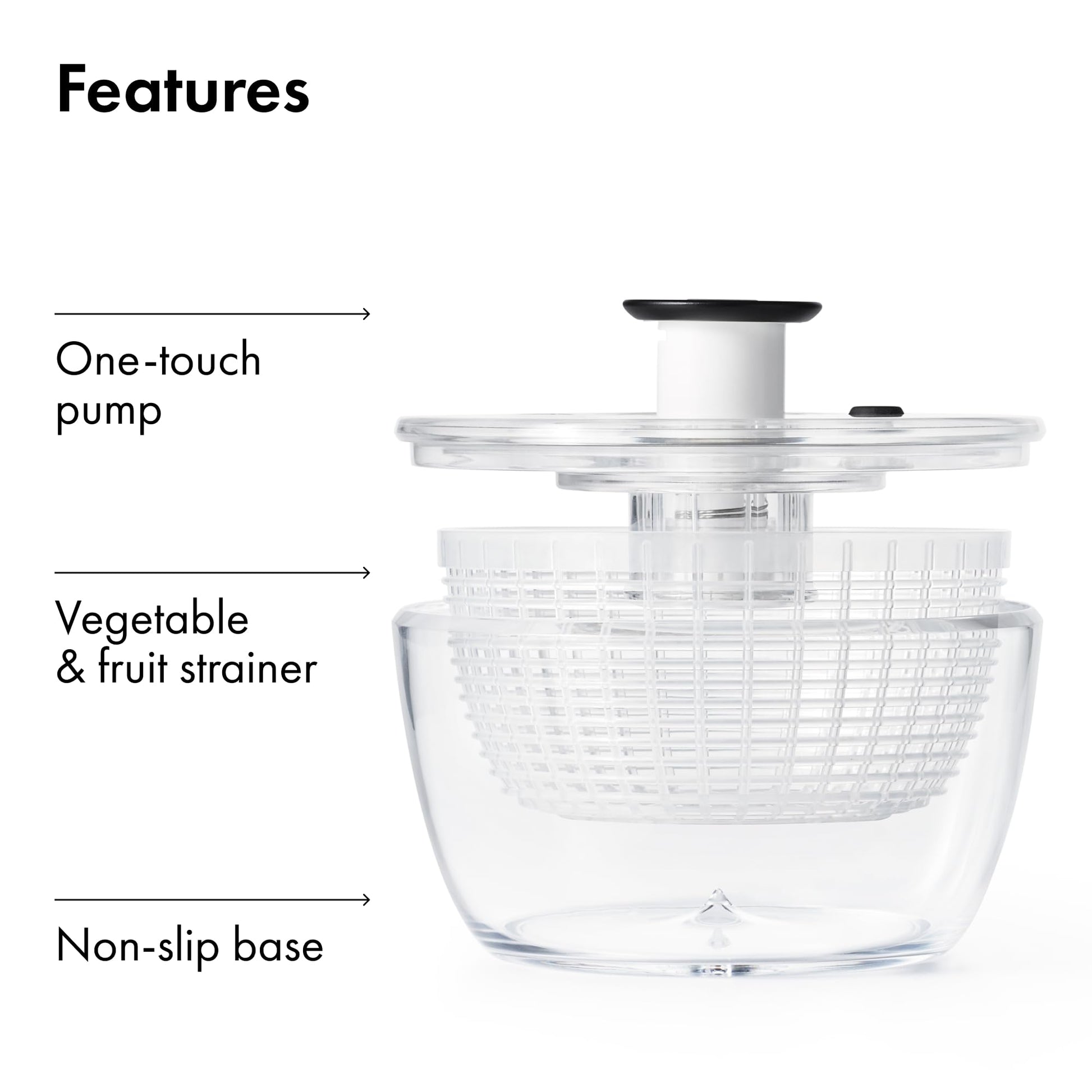 Presiona el botón superior para hacer girar el canasto interior con fuerza. Seca hojas de lechuga, espinaca, acelga, frijoles, brócoli o frutas como si nada. ¡Máxima eficiencia sin complicaciones!