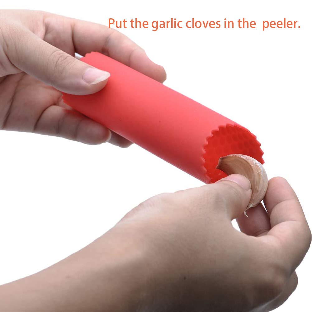 - El pelador de ajo está hecho de caucho de silicona de grado alimenticio, a prueba de moho, sin sensación de decoloración y cómodo.