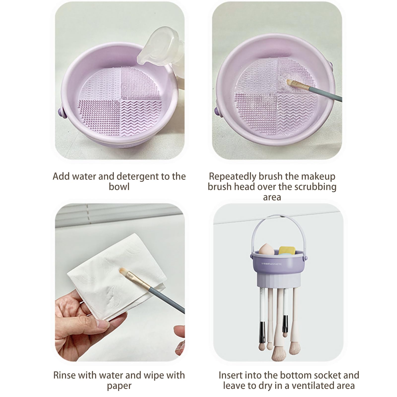 - Diseño tres en uno: Este bol para limpiar brochas de maquillaje combina las funciones de lavado, secado y almacenamiento. La parte superior está diseñada con varias texturas para limpiar en profundidad todo tipo de brochas de maquillaje y huevos de belleza; la parte inferior está diseñada con ranuras de distintos tamaños para guardar brochas de maquillaje de distintos tamaños. Además, también se puede utilizar como organizador de brochas de maquillaje dándole la vuelta.
