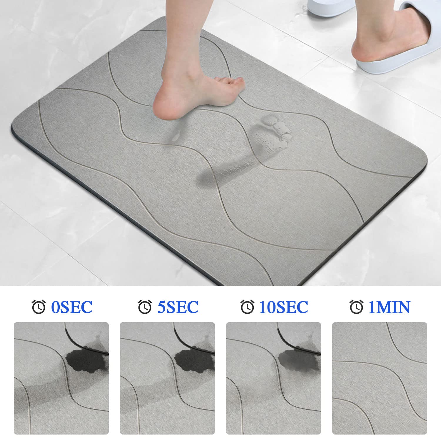 No solo es perfecta para el baño: úsala también en la cocina, en la piscina, como tapete para cuencos de mascotas 🐶, platos 🍽️ o en la entrada del hogar. Su diseño elegante con ondas grises combina con cualquier estilo.